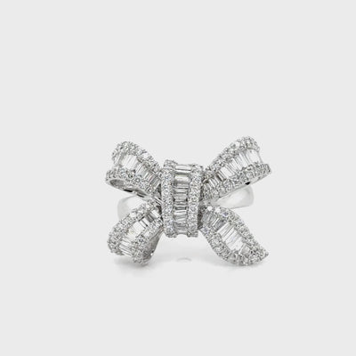 Our Bow ring features 81x round brilliant cut natural diamonds and 43x baguette cut natural diamonds of G-H colour, SI clarity for a combined total weight of approximately 1.00 carat. The diamonds are set in an 18 karat white gold intricate bow-knot style setting. This ring is currently size 5.75 "K.5" and can be resized.