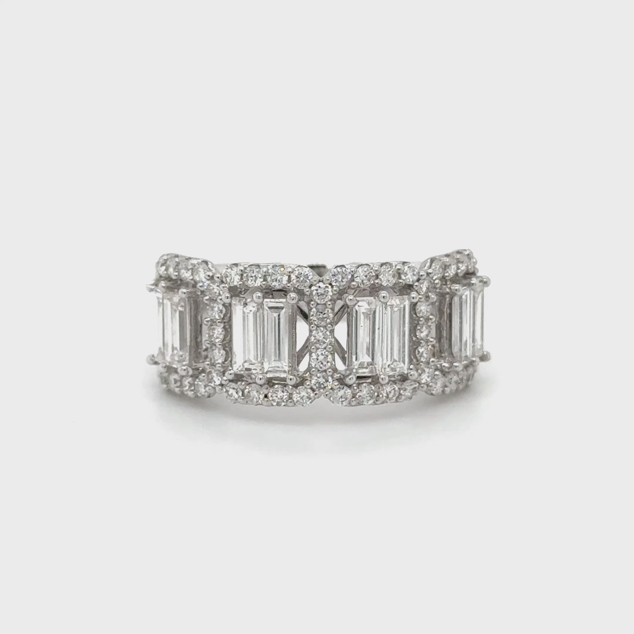 This ring features 8 baguette cut diamonds totalling 1.219ct and 47 round brilliant cut diamonds totalling 0.75ct. The diamonds are G-H colour, VS-SI clarity and the total diamond weight is 1.969ct . Claire is currently available in 14K White Gold, size 7 (N).