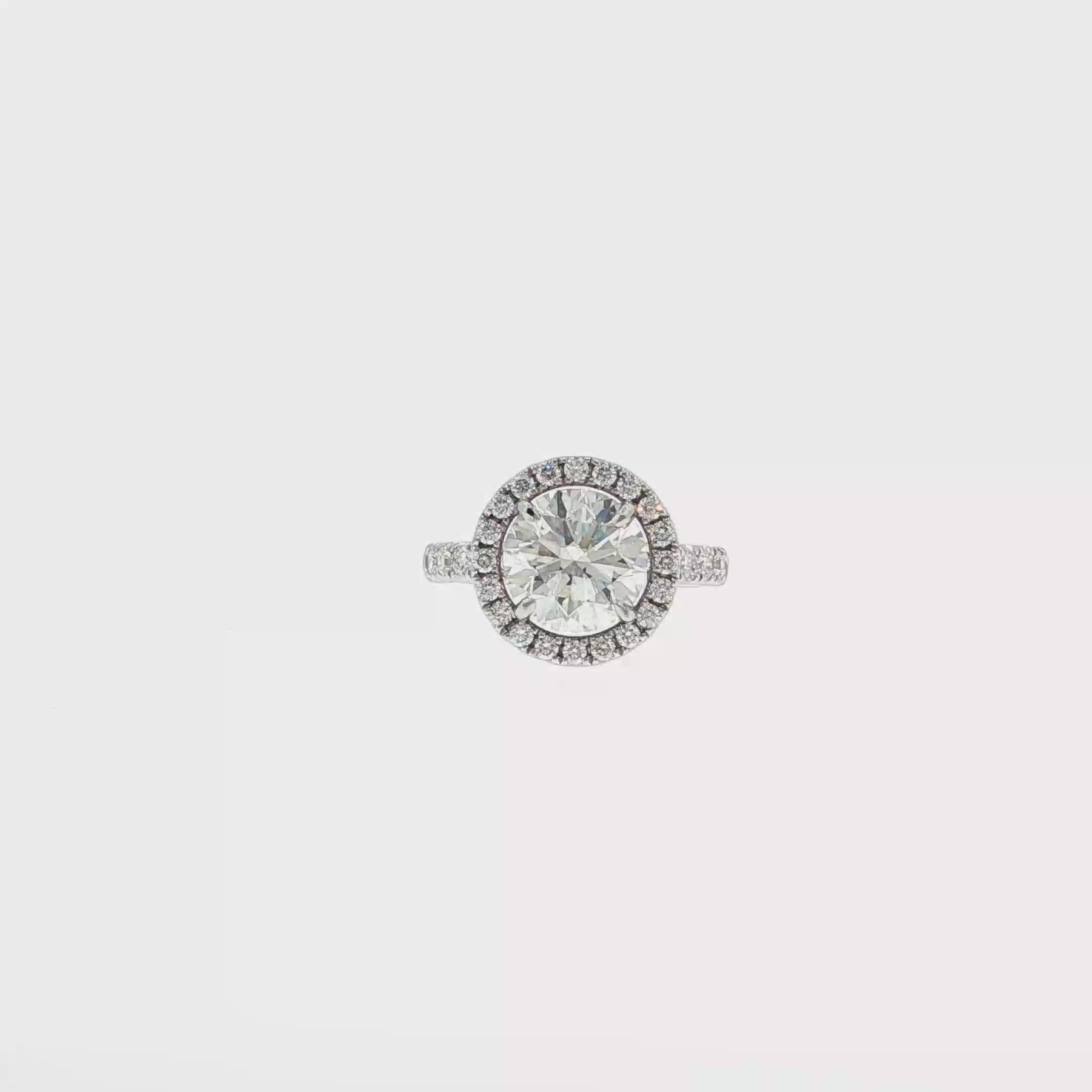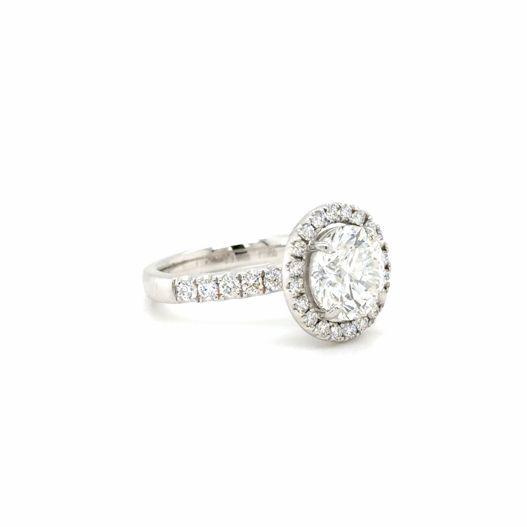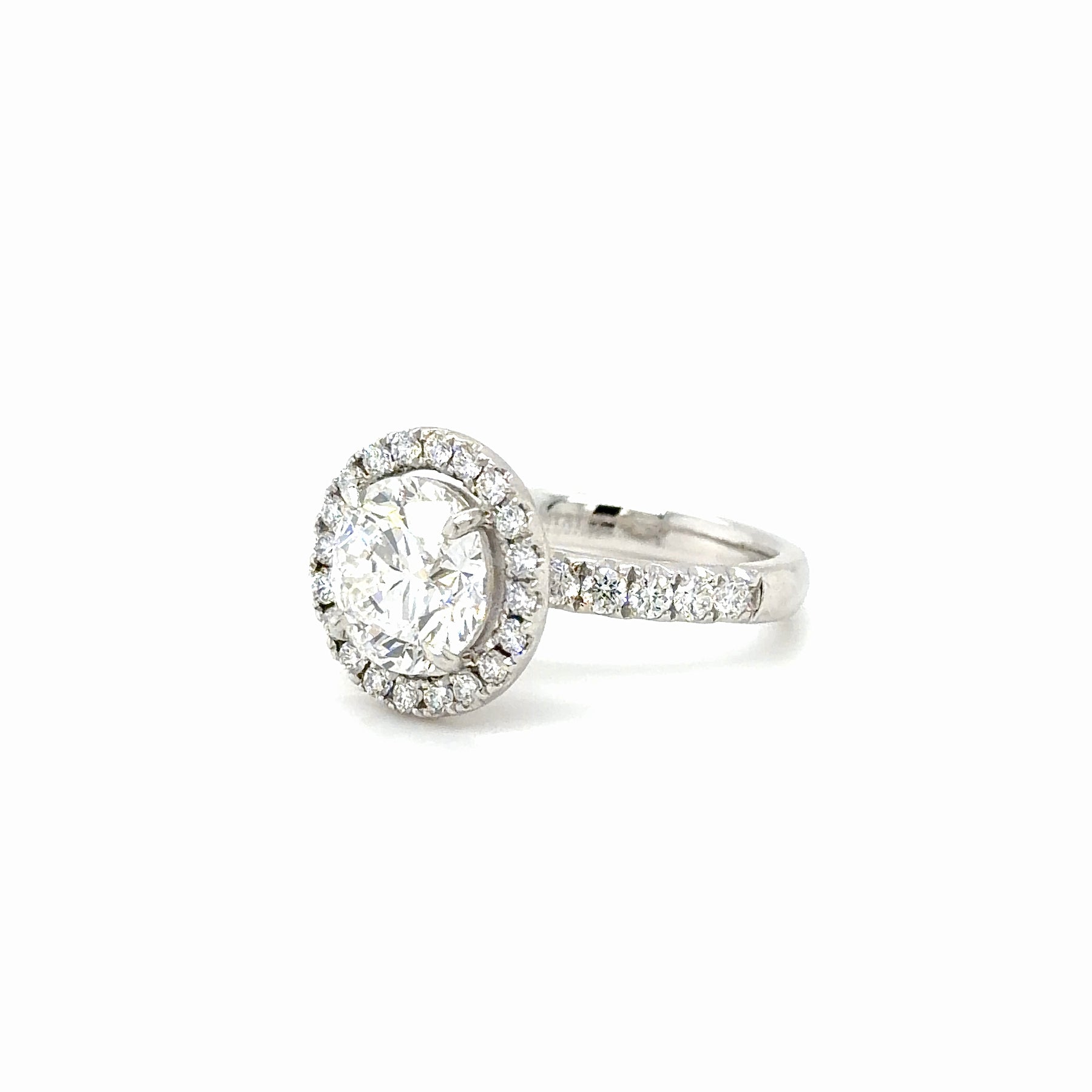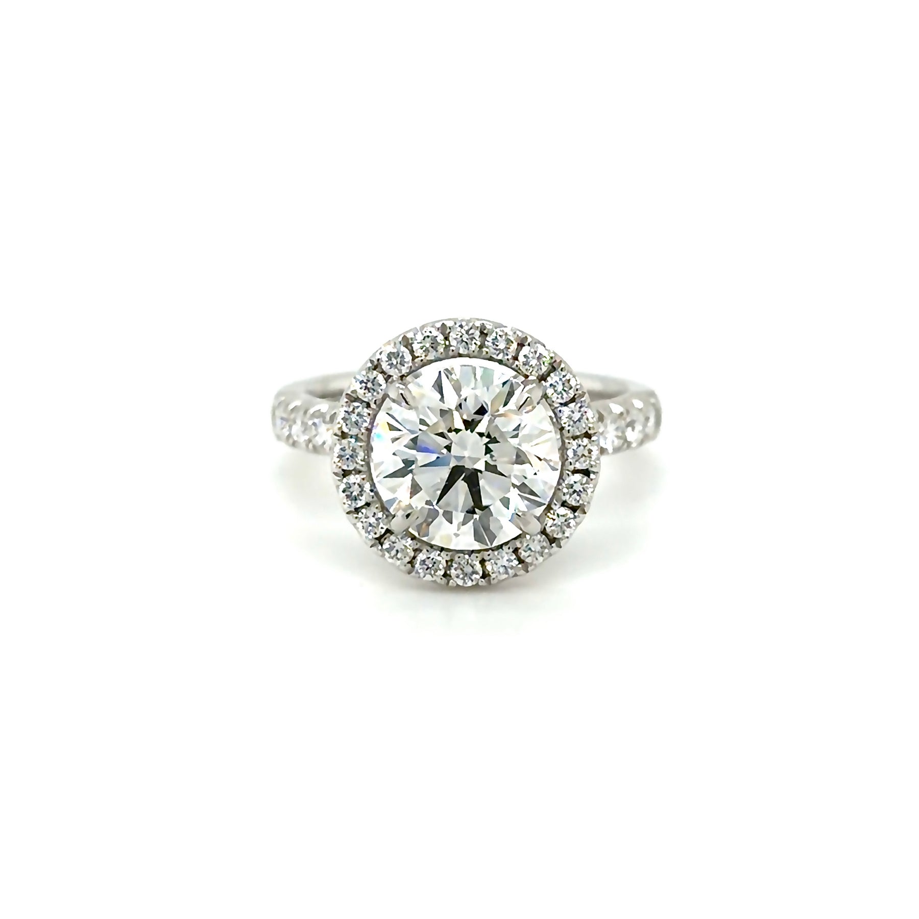 Eva centres a breathtaking 2.79ct round brilliant cut diamond of F colour and SI2 clarity, GIA graded & inscribed. The diamond is set in a halo style setting with 30 round brilliant cut diamonds totalling 0.641ct. The diamonds are F colour and VS-SI clarity.