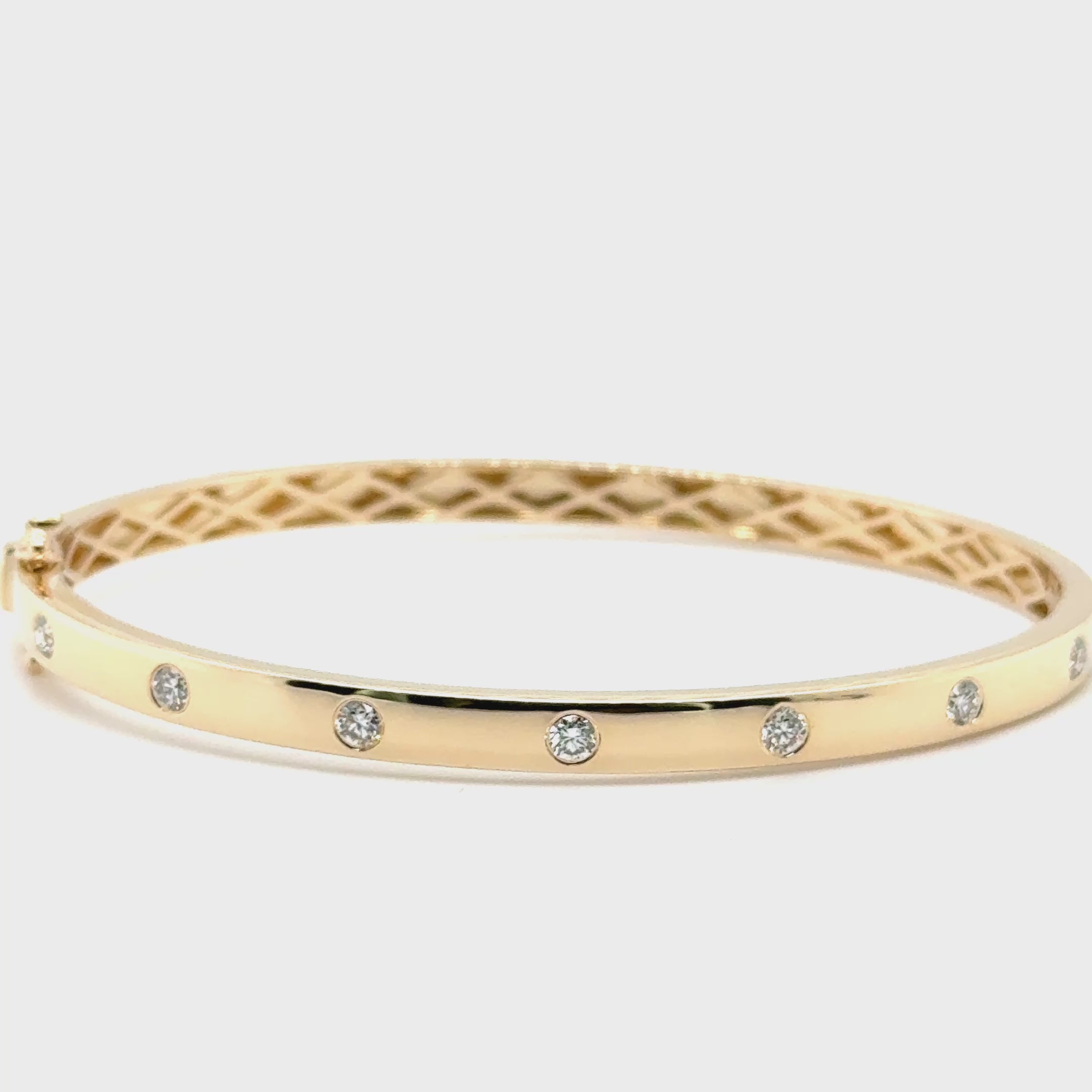 This oval-shaped bangle features a side hinge and is set with 7x round brilliant cut natural diamonds weighing a total of ~0.50ct. The diamonds are of G-H colour and SI clarity.