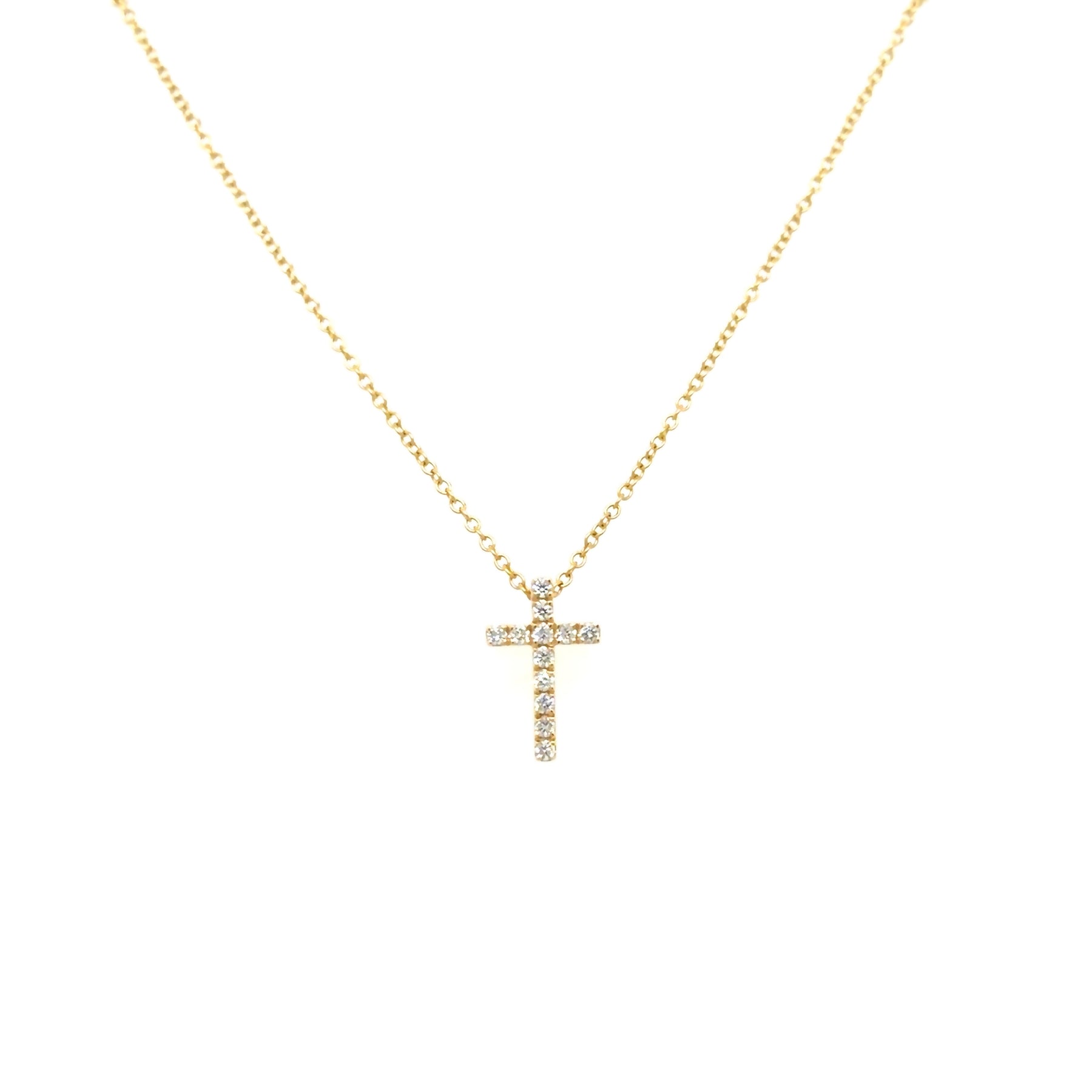 This diamond cross pendant features 12 round brilliant cut diamonds with a total diamond weight of 0.10ct. The diamonds are G-H colour and SI clarity, set in 18k yellow gold. The pendant comes with an adjustable 18k gold chain.