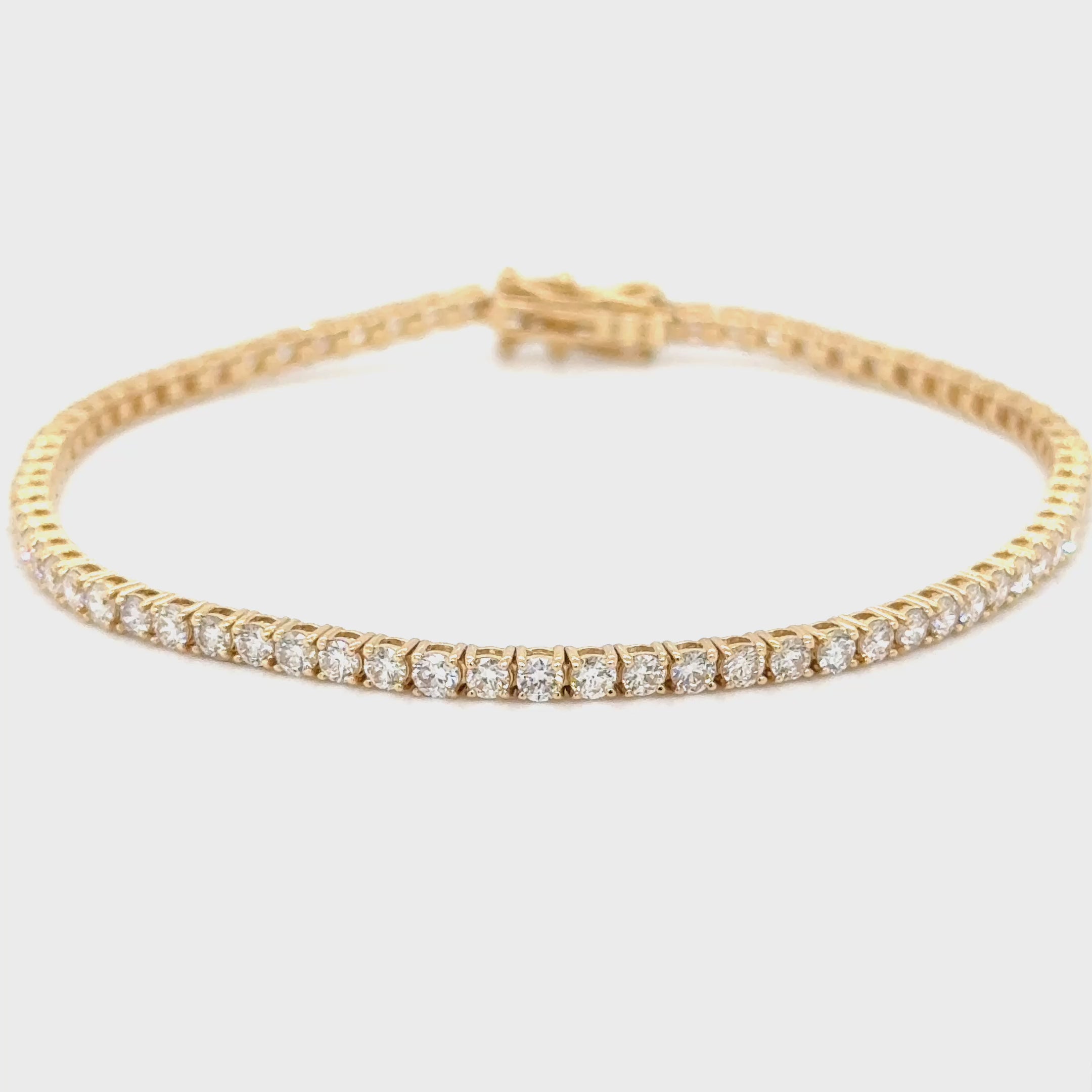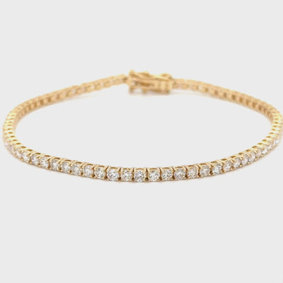 Our gorgeous Alexia diamond tennis bracelet is a jewellery wardrobe staple. Set in bright and weight platinum, the Alexia features 74 round brilliant cut diamonds of G-H colour, SI clarity for a combined diamond weight of 3.06 carats. The diamonds are set in 14K Yellow Gold.