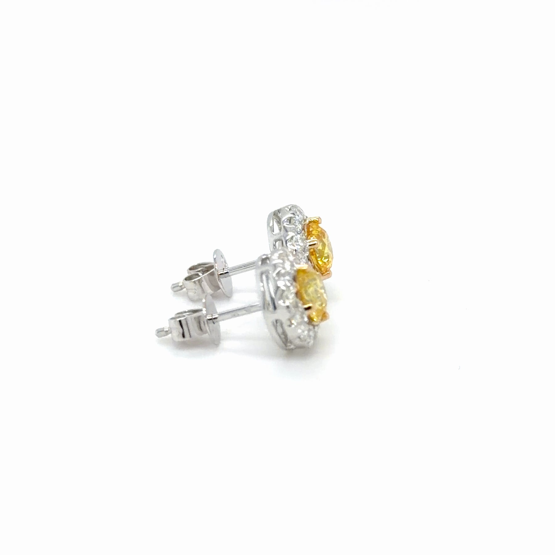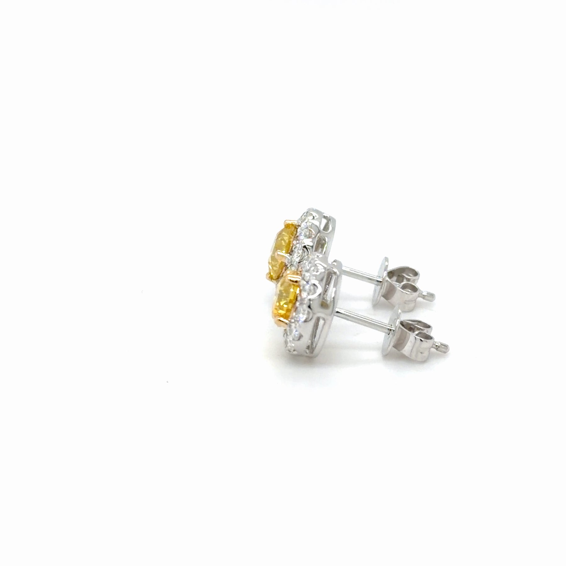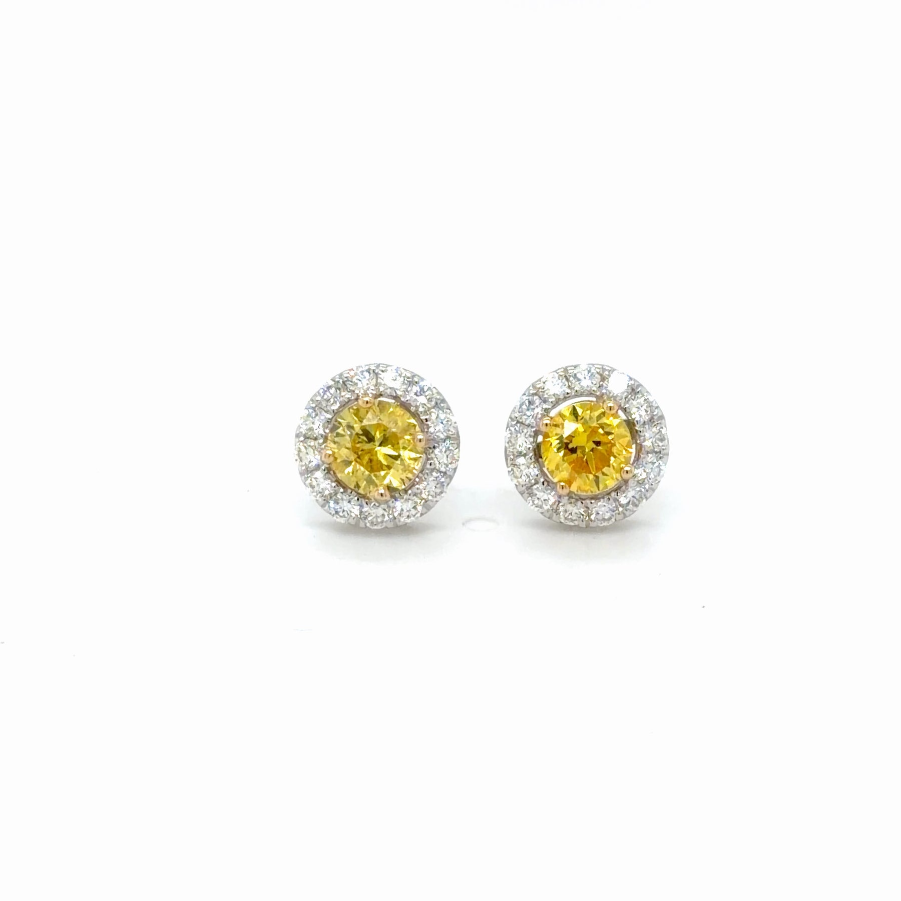 Winona features two stunning 'Fancy Vivid Yellow' round brilliant cut diamonds. The total diamond weight is 1.01ct and the diamonds are I2 clarity, GIA certified. The yellow diamonds are set in 18k two-tone gold in a halo-style setting with 26 round brilliant cut diamonds (0.44ct) of F-G colour and SI clarity.